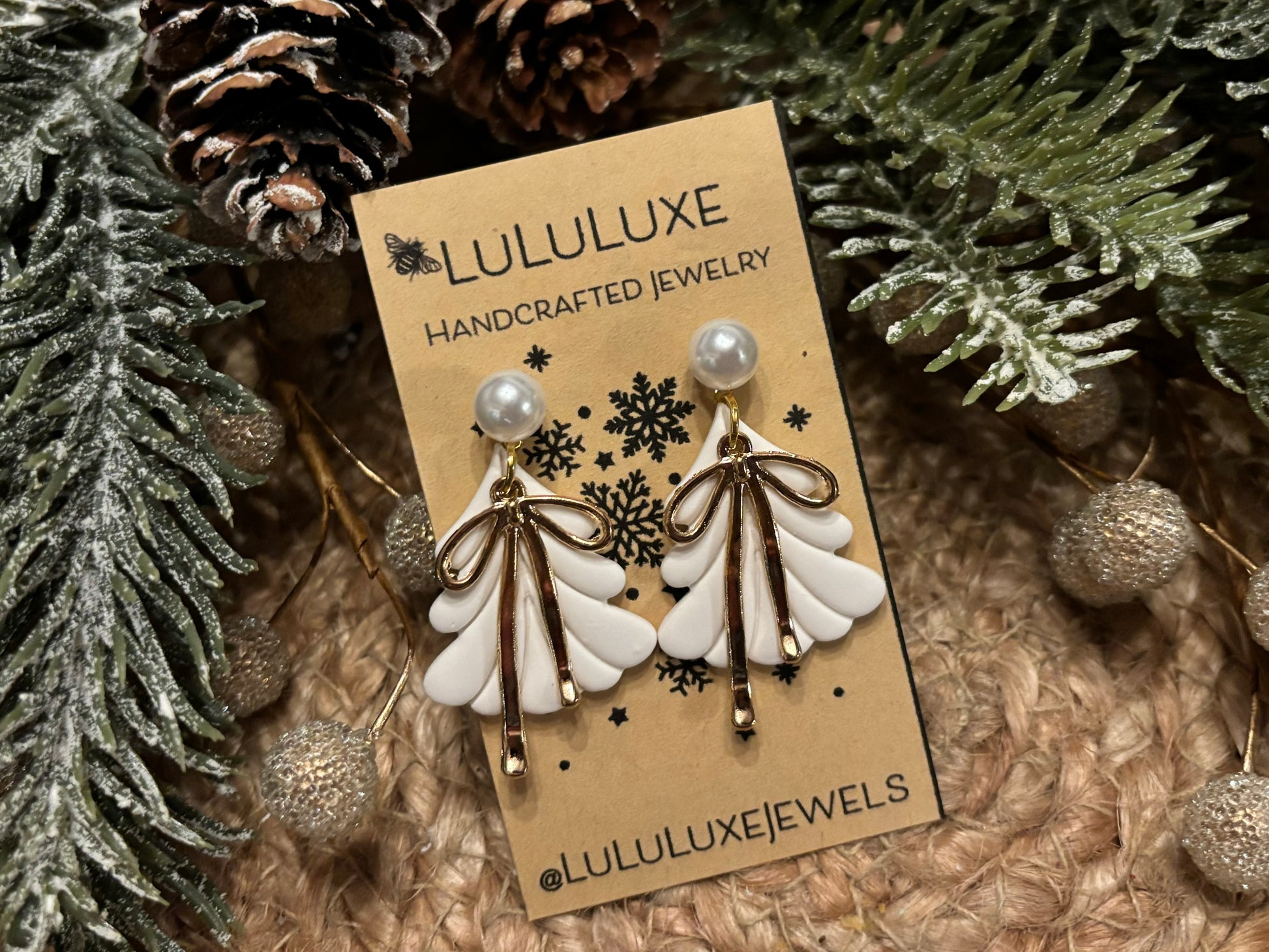 These handcrafted white Christmas tree earrings have been carefully designed with gold bows, making them the perfect accessory for the holiday season. The elegant and festive design is sure to add a touch of charm to any outfit. Crafted with precision, these earrings are a must-have for any Christmas enthusiast.