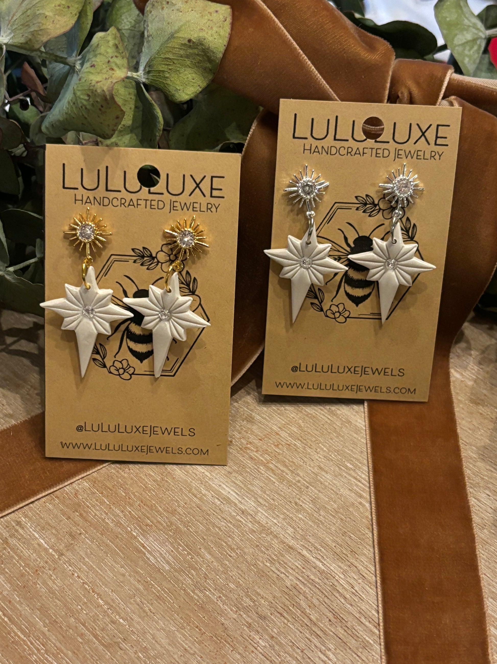 These handmade North Star dangles are perfect for adding a touch of sparkle to your wardrobe. Adorned with a crystal , these earrings are sure to catch the eye. Elevate your style with these elegant and unique statement pieces.