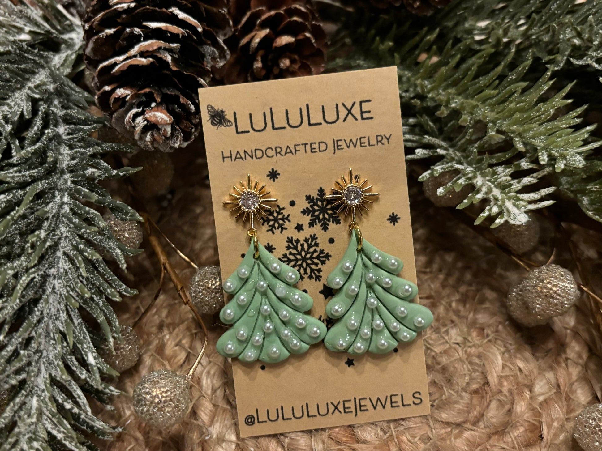 Introducing Pearl Trees - the timeless Christmas tree earrings adorned with elegant pearl ornaments. These classic earrings add a touch of sophistication and holiday spirit to any outfit. Elevate your style this season with Pearl Trees.