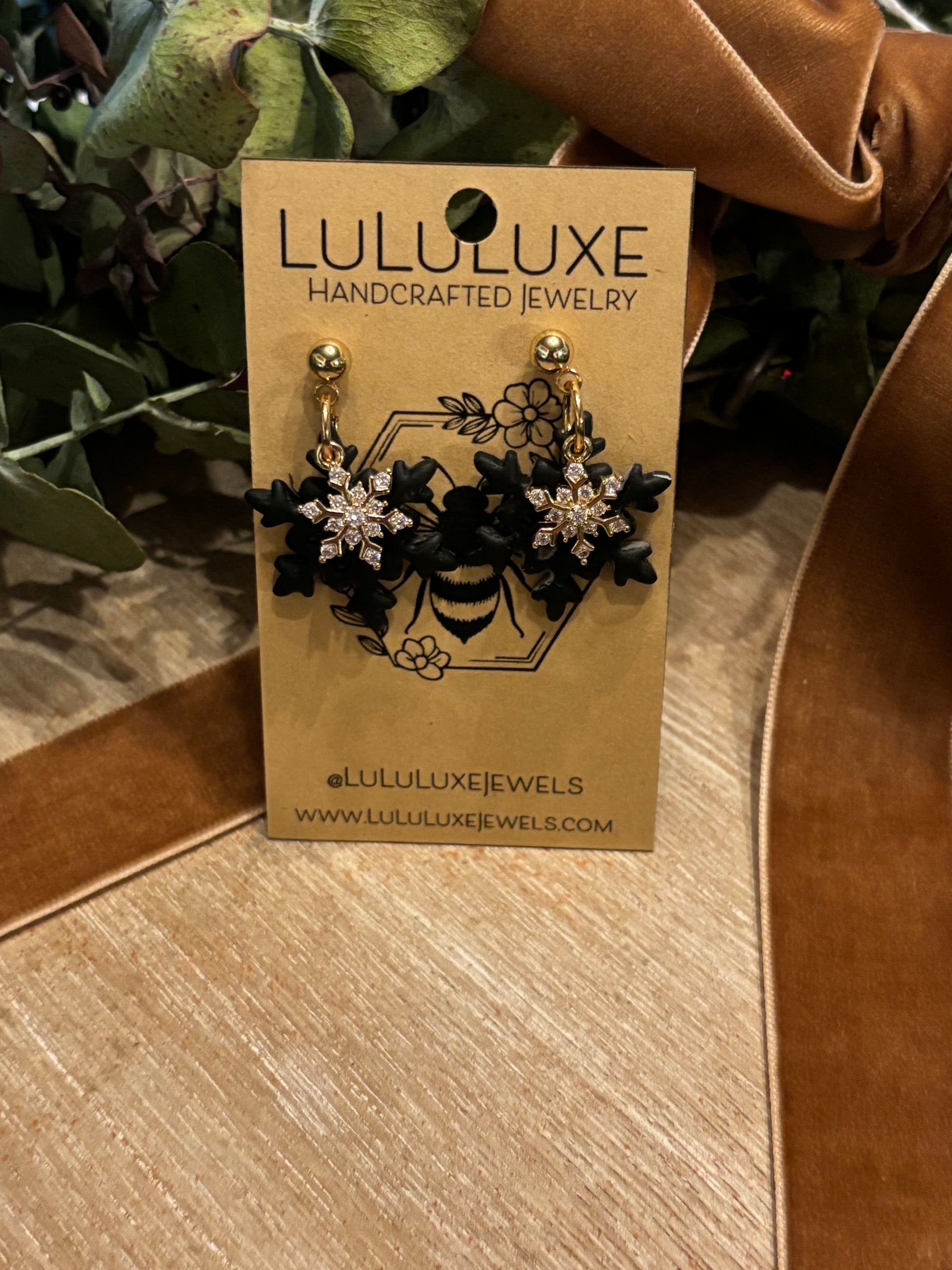 Black snowflakes with a crystal accent. Sure to make any wardrobe stand out